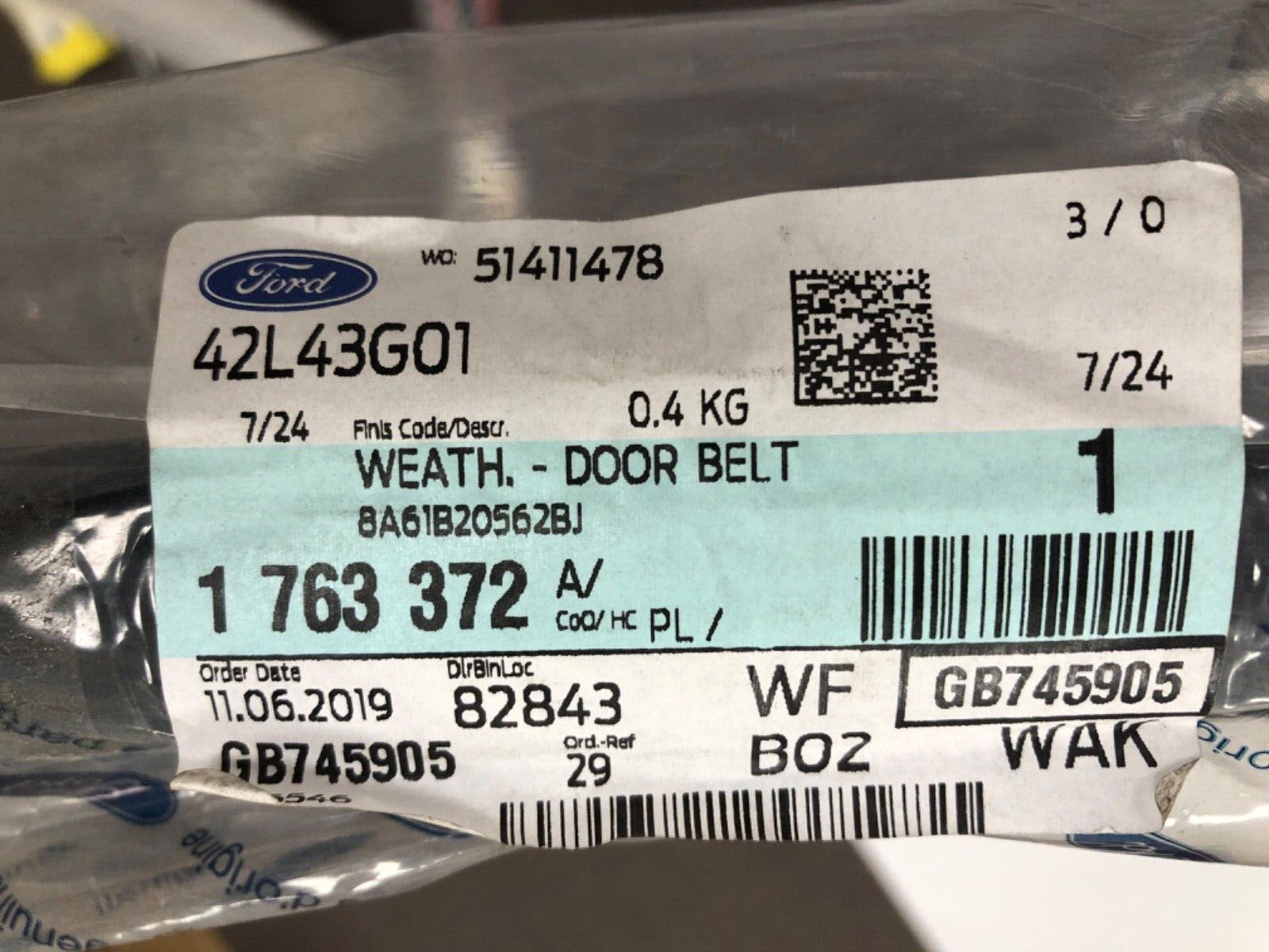 Genuine Ford Fiesta MK7 O/S Front Door Belt Weatherstrip Part no:  1763372 Suitable for:Ford Fiesta MK7 2008-2012*If...