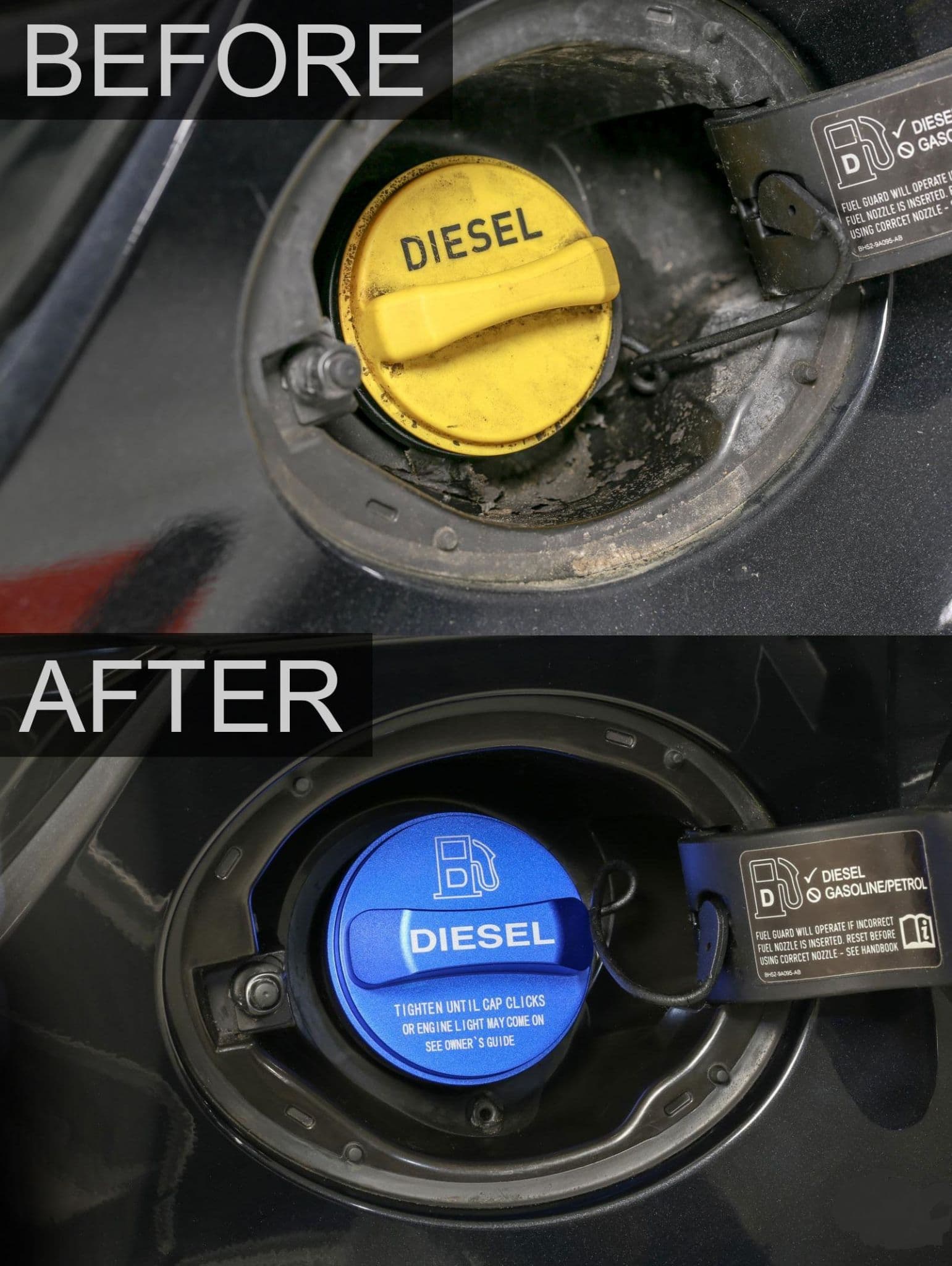 Fabriqué à partir d'aluminium billette, il s'agit d'un couvercle à installer sur le bouchon de remplissage de carburant en plastique. Ajoutez cette touche finale à votre Jaguar en installant l'un de ces bouchons de remplissage de carburant en alliage. Avec le mot Diesel clairement gravé dans la finition anodisée bleue, vous vous assurerez de mettre le bon carburant dans votre voiture. Nous les avons également disponibles dans une finition anodisée rouge - voir nos autres articles. Ceux-ci s'adaptent au bouchon de réservoir existant à l'aide du ruban adhésif double face pré-installé - nous avons également inclus de l'adhésif silicone pour ajouter une forme supplémentaire de fixation sécurisée.