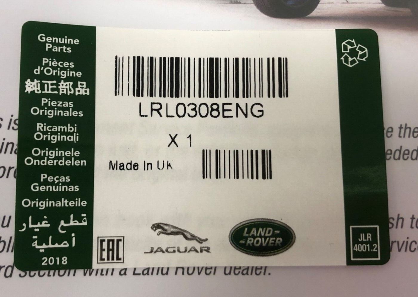 Genuine Land Rover Service Portfolio Replacement LRL0308ENG