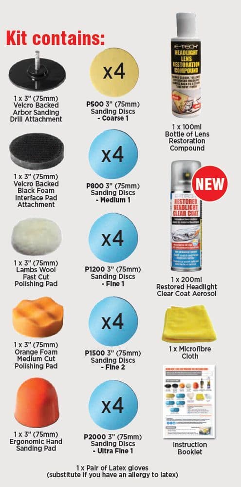 This E-Tech Headlight Lens Restoration Kit offers a quick & simple DIY solution to remove cloudy and yellow discolouration as well as any oxidisation marks, dull spots, scuffs and fine scratches and returns headlight lenses back to a clear "Like New" condition!